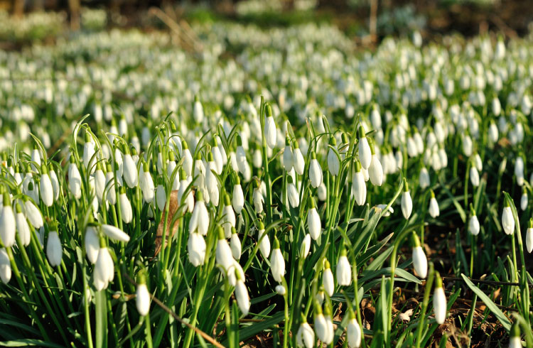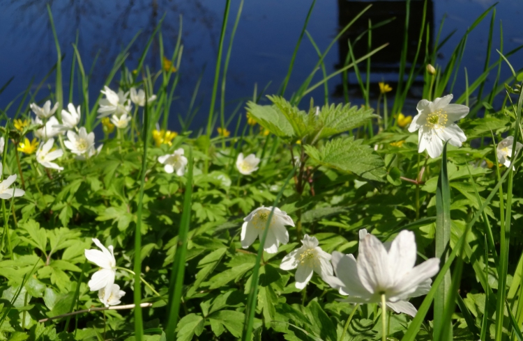 weißblühenden Frühlingsanemonen und Schneeglöckchen das Auge.