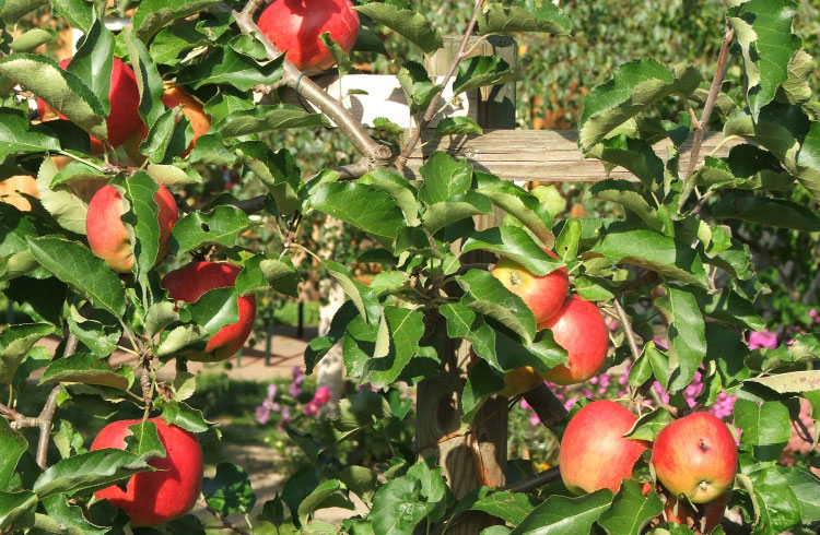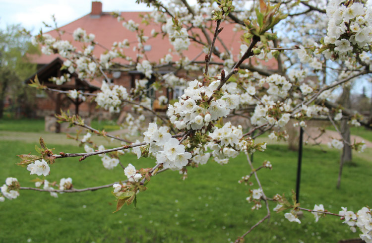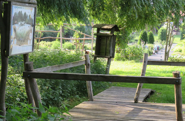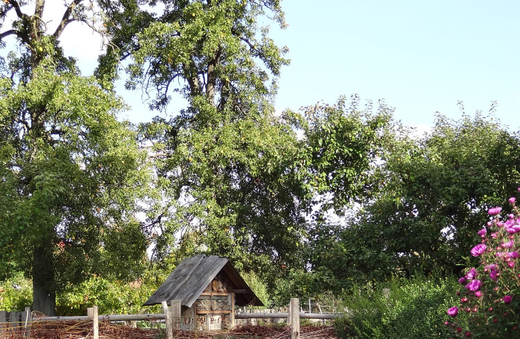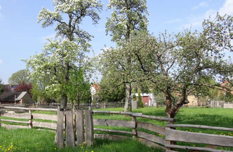 Obstanbau wie in früheren Zeiten mit vielen alten, hochstämmigen Obstbäumen und -sorten aus dem norddeutschen Raum. Die Streuobstwiese gehört zu