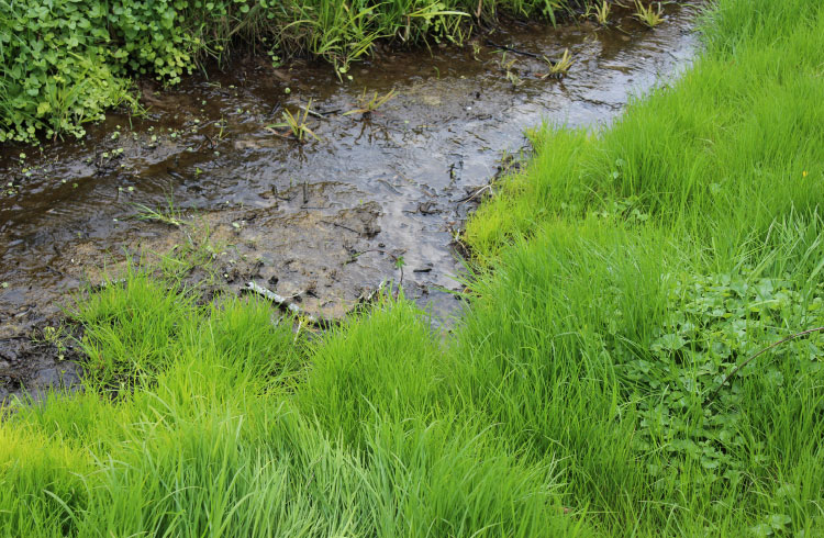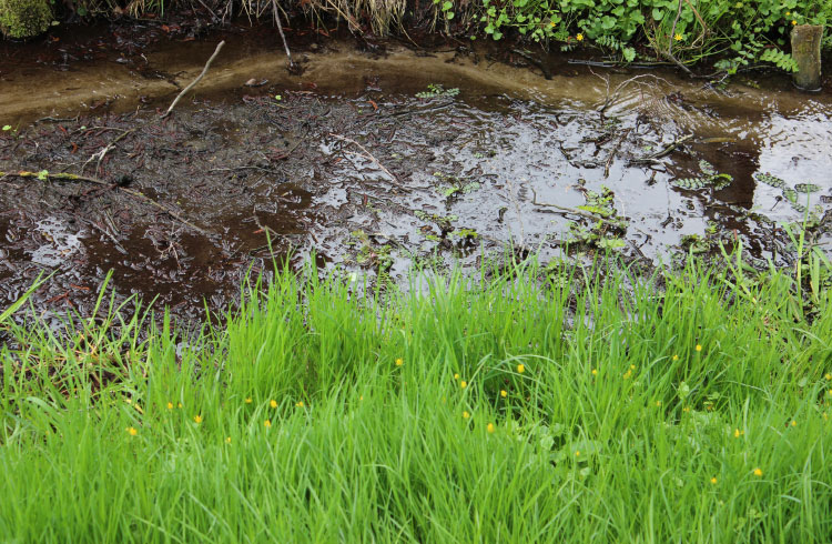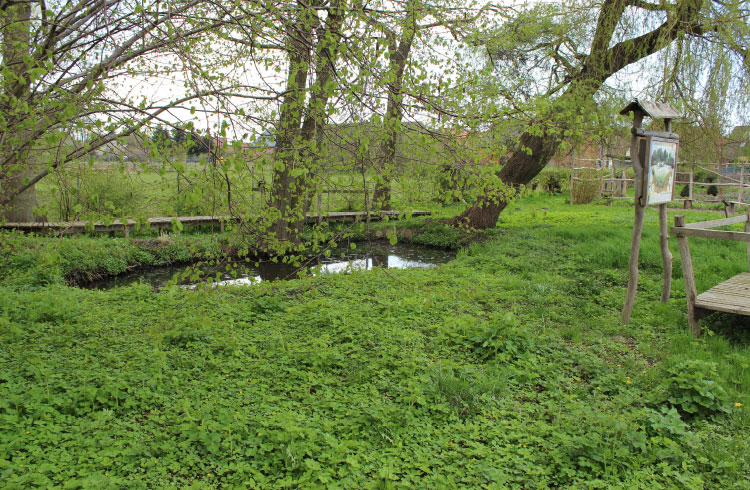 der beiden Gräben so reduziert wurde, dass sich der Wasserstand des vorhandenen Teiches auf dem Pfarrgrundstück einpegelte. Dadurch wurde die